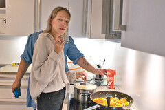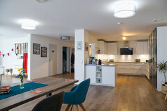 Mittelpunkt ist die offene Wohnküche mit Tischen und Sitzecke, auch ein Fernseher und eine Musikanlage stehen zur Verfügung. Hier ist der Treffpunkt für alle Mahlzeiten. Soweit möglich werden die Mahlzeiten gemeinsam und nach Wunsch vorbereitet.